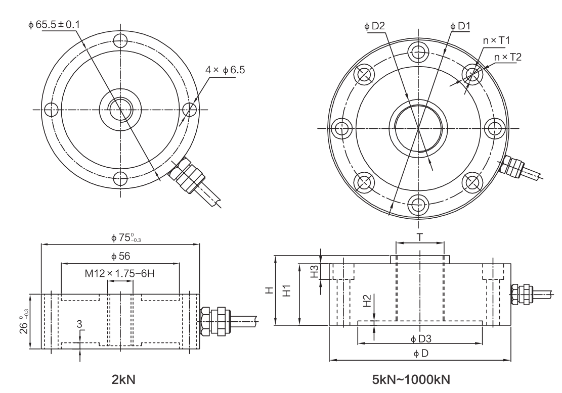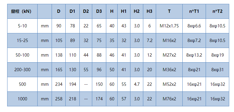 量程:2kN(200kg)、5kN(500kg)、10 kN(1t)、15 kN(1.5t)、20 kN(2t)、25 kN(2.5t)、30 kN(3t)、50 kN(5t)、100 kN(10t)、200 kN(20t)、300 kN(30t)、500kN(50t)、1000kN(100t).